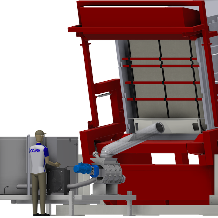 Der Auflieger kann einerseits mit unserem Drehventil VSFC 320 und mit allem notwendigen Zubehör für die Steuerung des Aufliegers und den pneumatischen Transport des Materials ausgestattet werden. Wenn der Auflieger jedoch nicht mit einem Drehventil ausgestattet ist, kann er auf einer Plattform mit einem Verdichter für den pneumatischen Transport geliefert oder einfach auf einem Hubwagen installiert werden, wenn der Auflieger über einen eigenen Verdichter verfügt.